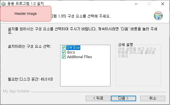 ; MUI Settings섹션에 아래 스크립트를 넣어준다.; Header image 사용 선언 !define MUI_HEADERIMAGE ; 인스톨 이미지 설정 !define MUI_HEADERIMAGE_BITMAP "C:\Study\NSIS\Images\header.bmp" ; 이미지 경로 입력 !define MUI_HEADERIMAGE_BITMAP_NOSTRETCH ; 이미지 사이즈 그대로 출력 : 왜곡 없는 대신 최대 사이즈 넘어가거나 작은 경우 이상하게 보일 수 있음 ; 언인스톨 이미지 설정 !define MUI_HEADERIMAGE_UNBITMAP "C:\Study\NSIS\Images\header.bmp" !define MUI_HEADERIMAGE_UNBITMAP_NOSTRETCH